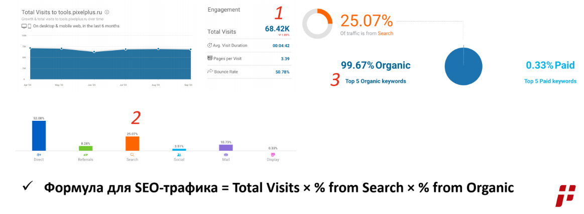 Таким образом, SimilarWeb объединяет два источника — органику и платную выдачу. В представленном примере суммарное количество визитов сайта составляет 68,42К, доля поискового трафика = 25,07%, а доля органики = 99,67%.