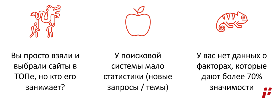 Нужно знать, какие сайты отбираются для анализа, поэтому далее мы поговорим о том, почему не работает подход, когда в выборку попадают сайты вперемешку. Проблемы также могут возникнуть из-за того, что сформированный поисковый запрос или тема — новая для поисковой системы, и ей не хватает статистических данных для анализа. Часто оказывается так, что в новых тематиках отсутствуют нужные пользователю и поисковой системе типы документов. В данной ситуации анализ ТОПа не так важен — в первую очередь, нужно создать удовлетворяющие запросам пользователя документы. Еще одна ситуация, при которой аналитика ТОПА не приносит должного результата — у вас нет данных о факторах, которыми располагает поисковая система. В этом случае анализ по супер ВЧ запросам, когда у вас нет информации о кликовых поведенческих факторах и вообще о ПФ ваших конкурентов, может давать меньше профита, чем по низко- и среднечастотным запросам.
