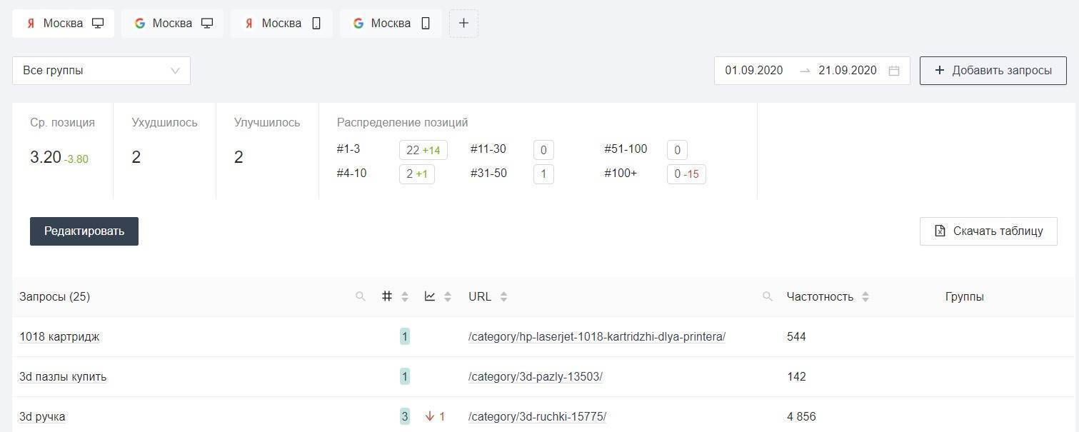 В разделе Запросы отображается статистика по добавленным ключевым словам. Во втором и третьем столбце со значком графика показано, на сколько в среднем выросла или упала позиция по сравнению с проверкой в прошлый раз.