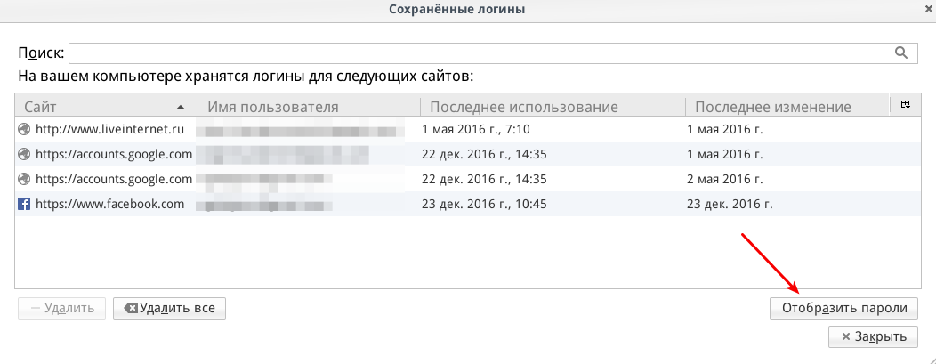 - появится окно со списком всех сохраненных в браузере логин/паролей;