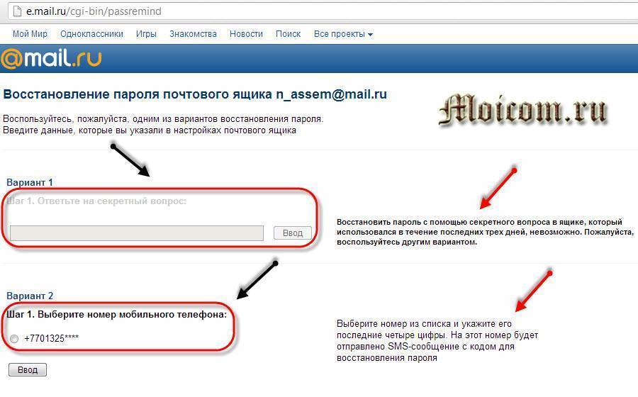 Нам предлагают несколько вариантов, в зависимости от того, что вы выбирали и заполняли, когда создавали свой почтовый ящик. Нужно ответить на секретный вопрос или воспользоваться вторым вариантом, написать цифры телефона или будет что-то другое.