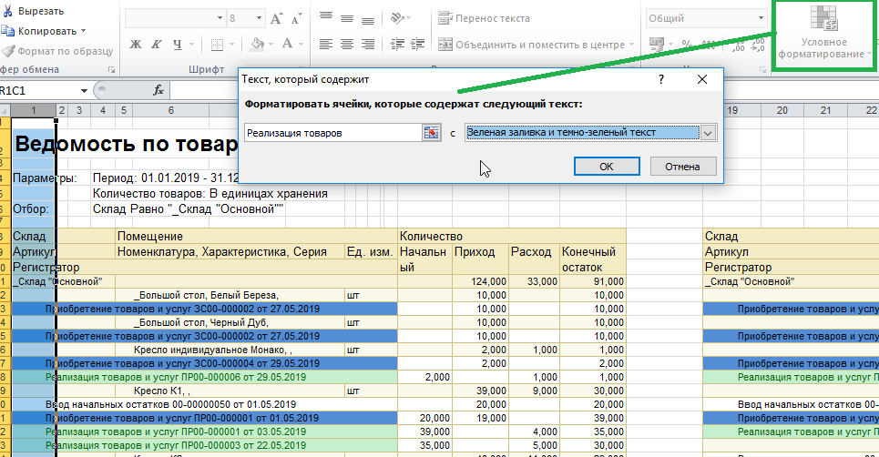 Напомним, что для этого надо использовать меню Главная – Условное форматирование – Правила выделения ячеек – Текст содержит…