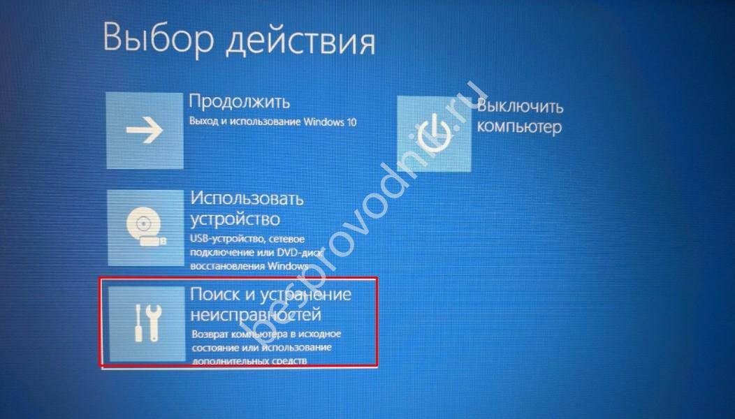 Шаг 2. Вы попадете в среду восстановления windows 10. В этой среде вы можете сбросить настройки, восстановить систему и многое другое. В среде восстановление, нажмите на Поиск и устранение неисправностей.