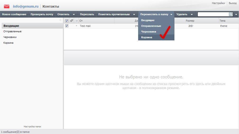затем, либо переместить эти письма в корзину, выбрав папку назначения «Корзина» в выпадающем меню “Переместить в папку”