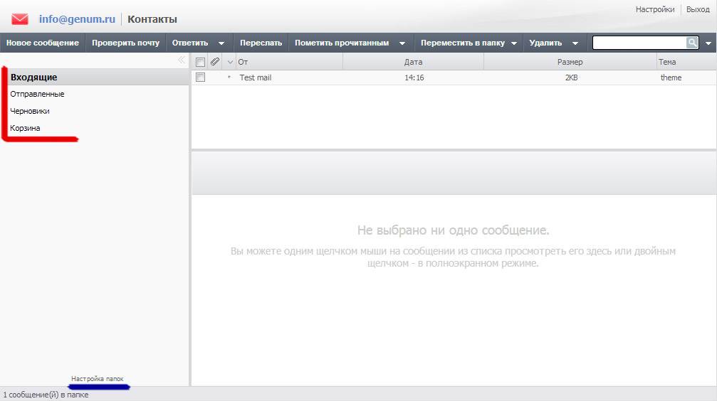 Слева будут четыре папки. Названия соответствуют назначению. К примеру, папка «Отправленые» предназначена для хранения отправленых писем.