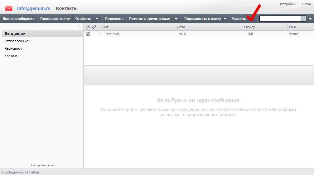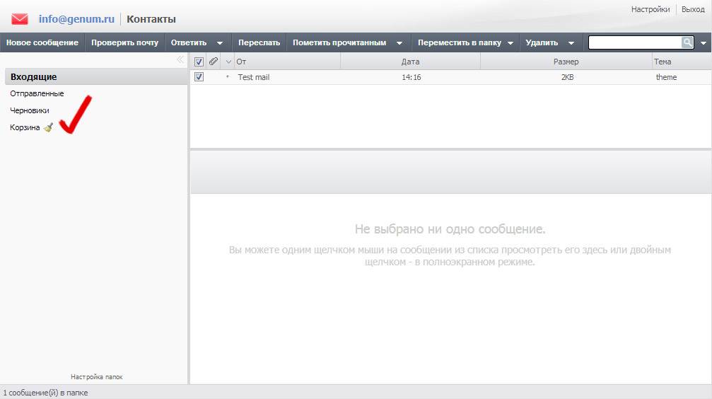Этих действий не достаточно, для освобождения места на сервере, т.к. мы просто переместили письма из папки «Входящие» в корзину. Для их полного удаления нужно нажать ссылку очистить рядом с корзиной.