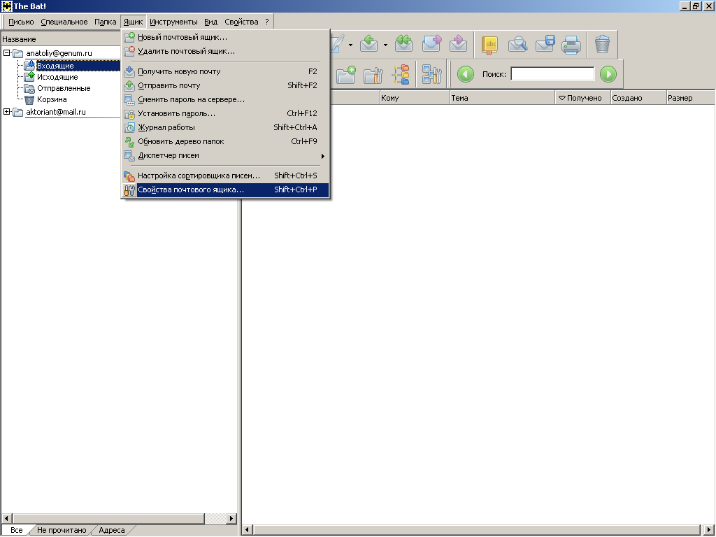 Для настройки автоматического удаления писем с сервера в The Bat нужно отредактировать свойства своего почтового ящика.
