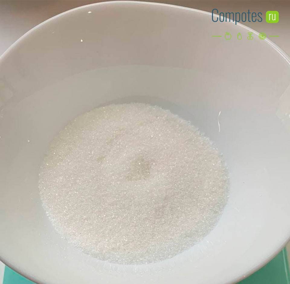 - После того, как время прошло, сливаем воду обратно в кастрюлю, добавляем два стакана сахара и варим сироп. В ингредиентах я указала количество сахара – по вкусу. Для меня это почти 400 грамм на 3-х литровую банку. Вы количество сладкого корректируйте как больше любите (просто пробуйте сироп, пока он варится).