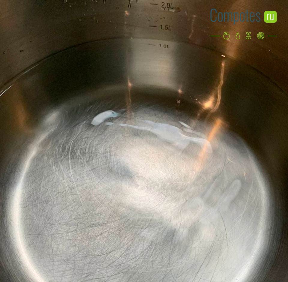 - Прокипятить воду с сахаром в кастрюле и вылить в тару с фруктами, наполняя ее до середины.