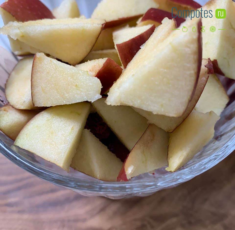 - В стерилизованные 3-х литровые банки укладываем подготовленные резанные яблоки. Заполняем приблизительно на 1/3 объема стеклянной тары. Замечание — чем больше добавим яблок, тем ароматней будет напиток, но самой жидкости получится мало. Так что не стоит увлекаться количеством и пытаться заполнить тару «под завязку».
