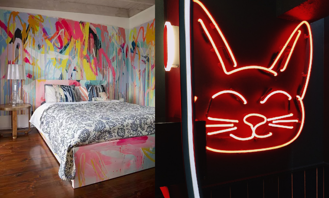 Контрастные обои, 3D или фотопечать можно заменить на яркое полотно. Неплохо смотрятся небольшие рисунки с блеском.