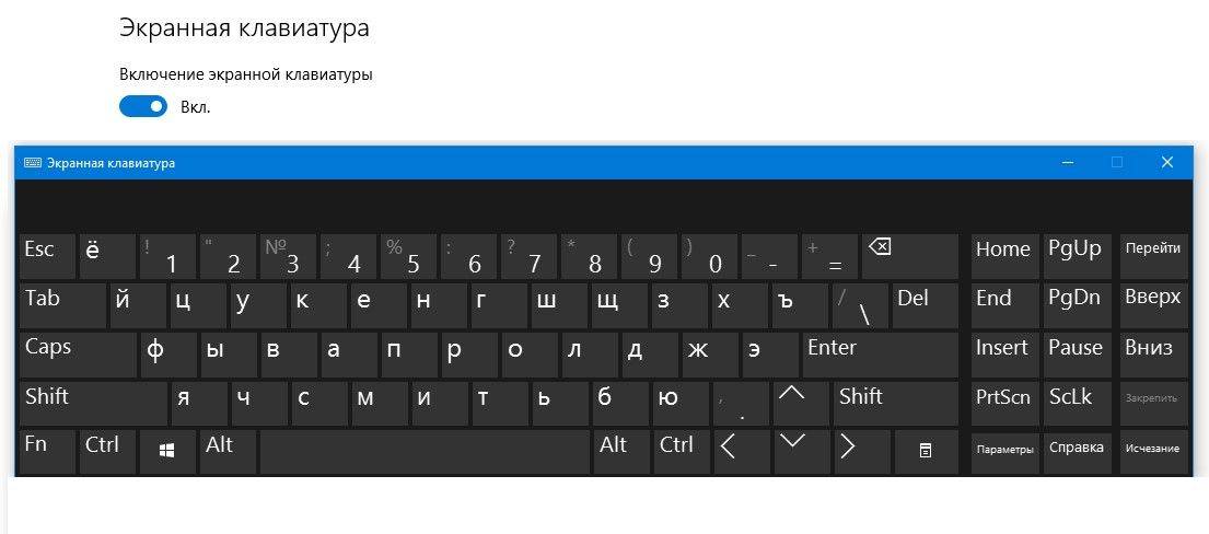 Откроется окно параметров «Клавиатура». И, теперь уже в правой части окна, переводим выключатель под надписью «Использовать экранную клавиатуру» в положение «Вкл».
