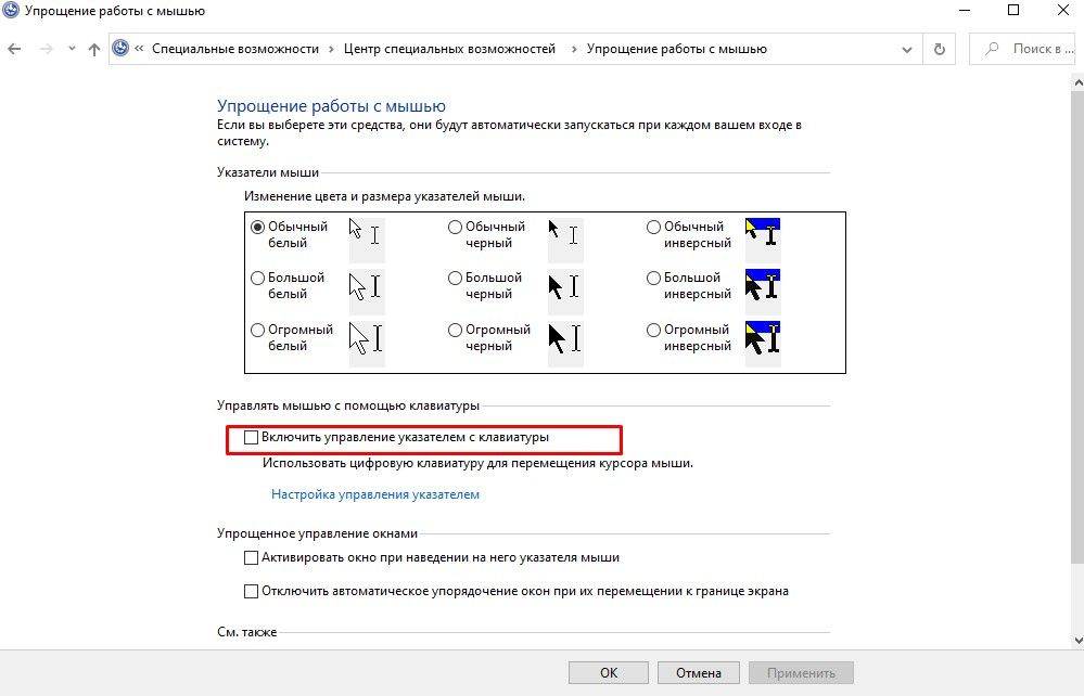 Затем снимите галочку с пункта «Включить управление указателем с клавиатуры», нажмите «ОК».