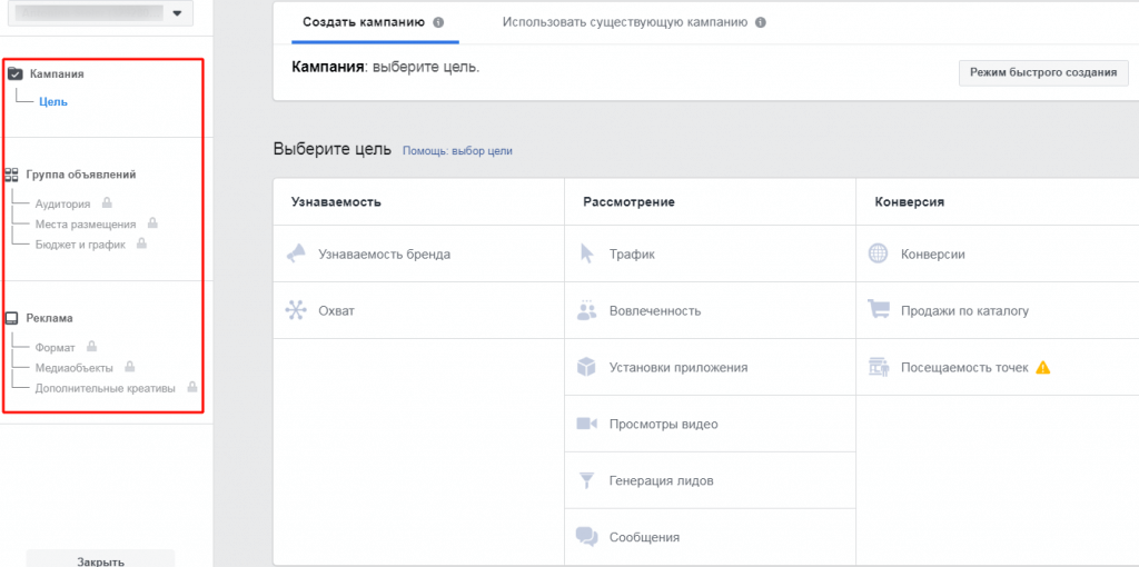 Ознакомьтесь с политикой Фейсбук в области размещения и предоставления рекламы и согласитесь с ней для дальнейшей работы в системе. Произойдёт переход на страницу Ads Manager, где с помощью меню, расположенного в левой части экрана, нужно поэтапно создать свой ролик.