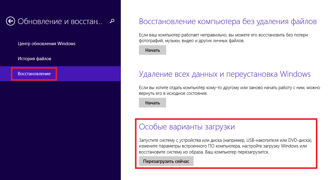 Теперь жмем «Восстановление» и вот он — заветный пункт «Особые варианты загрузки» — нажимаем на «Перезагрузить сейчас».