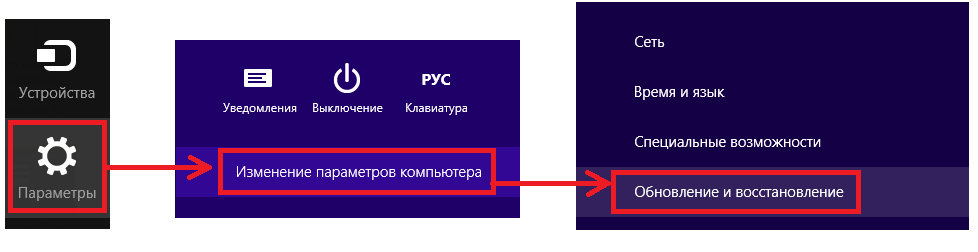Далее жмите пункт «Параметры», затем «Изменение параметров компьютера». После чего давите «Обновление и восстановление».