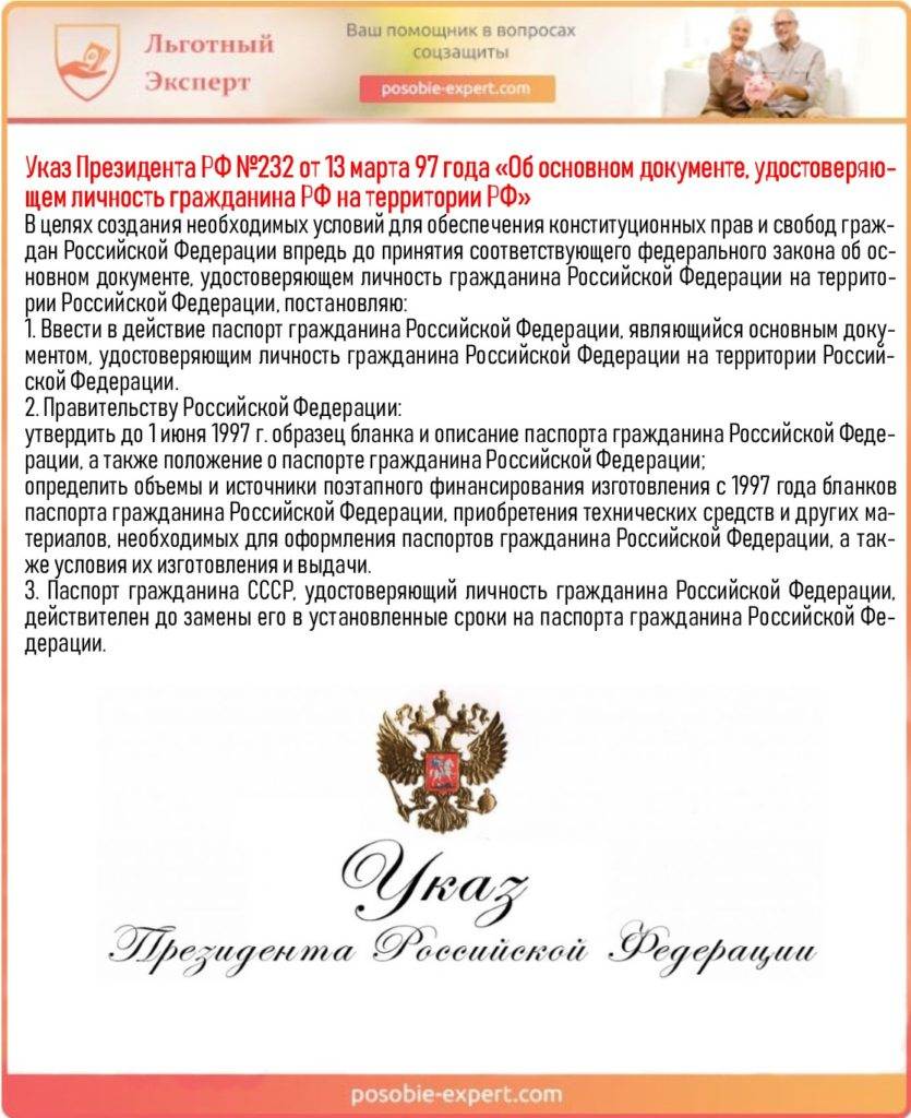 Указ Президента РФ №232 от 13 марта 97 года «Об основном документе, удостоверяющем личность гражданина РФ на территории РФ»
