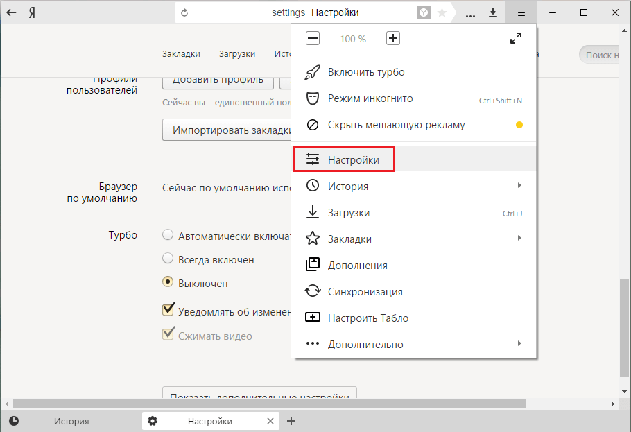 Открываем меню «Яндекс.Браузера» и выбираем «Настройки»