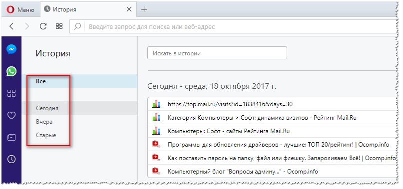 Кстати, сам журнал, на мой взгляд, даже поудобнее чем в Chrome. Здесь также можно искать в истории по определенному названию странички, сбоку есть удобный рубрикатор по датам: сегодня/вчера/старые.