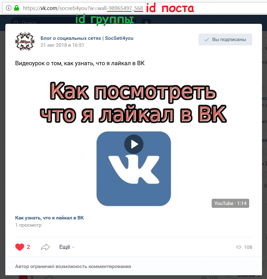 Обратите внимание на цифры после слова «wall». «-96339986» – это ID сообщества, «229» – ID записи ВКонтакте