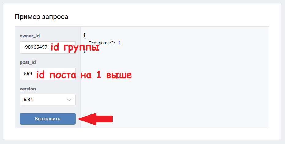 Кроме того, имеется пример для запроса. Потребуются определенные данные — это ID собственной страницы либо ID того паблика , в котором был размещен пост.