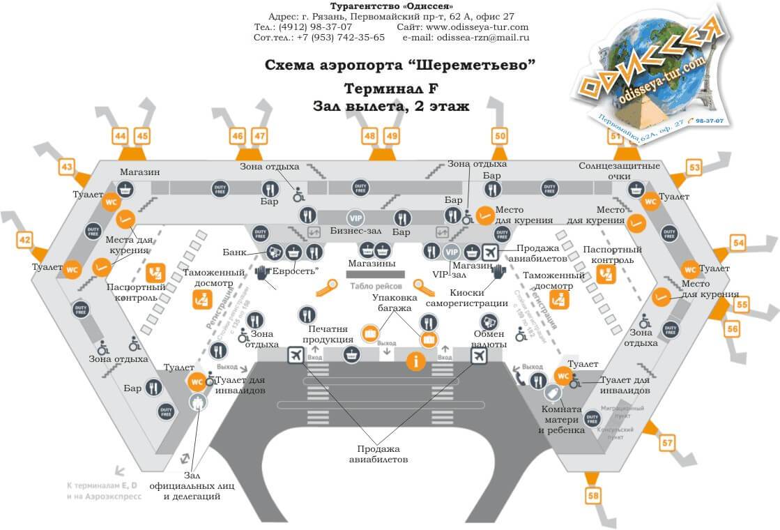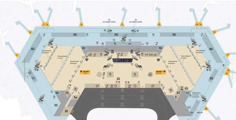 Схема 3 этажа.С 1 по 30 — это стойки регистрации русских авиалиний. А на первой, второй и третьей можно сдать багаж, не соответствующий заявленным авиакомпанией габаритам.