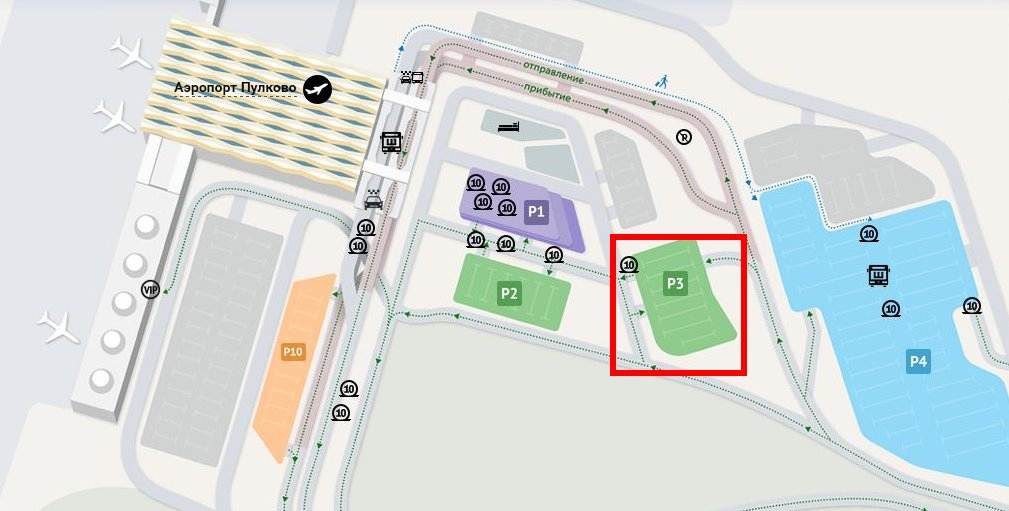 Р3. «Parking — S» Стоянка находится рядом с терминалом В. Стоимость составляет от 200 рублей в сутки или от 20 рублей в час до 10 часов. Предоставляет Бесплатную доставку в Терминалы А, B, С, D, E и F.