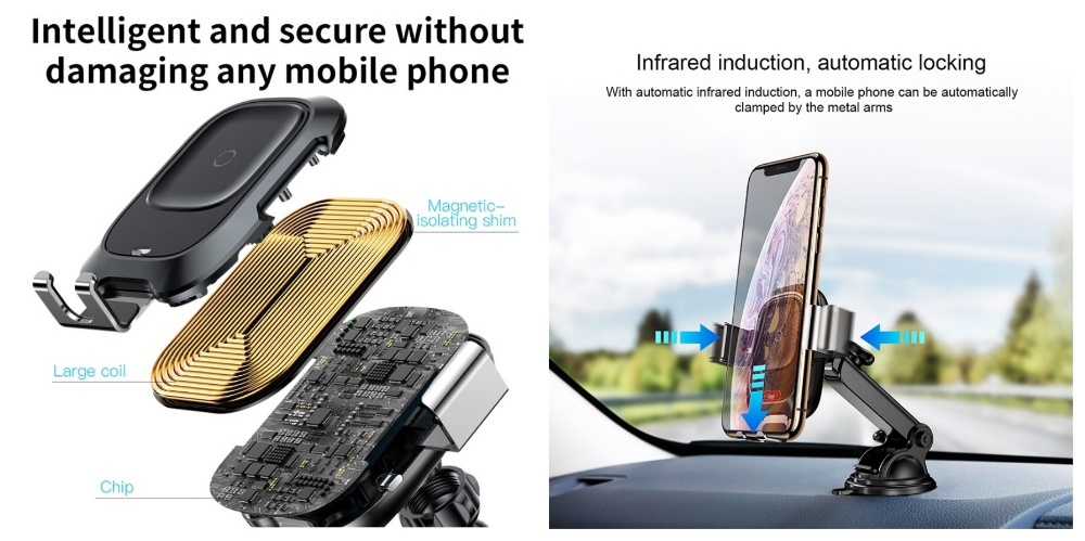 Вот ещё один автомобильный держатель телефона от Baseus. Как и Raxfly он имеет стильный дизайн и крепиться лобовому стеклу. Но есть одно небольшое дополнение — этот держатель может заряжать телефон, если телефон поддерживает беспроводную зарядку Qi.