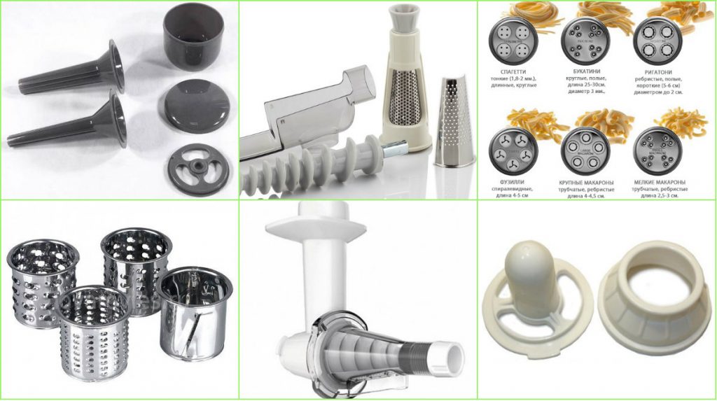 2. Насадки. Добавляются в комплектацию для расширения функциональности прибора. Чем больше насадок, тем шире возможности, и уже не стоит вопрос, что лучше купить мясорубку или блендер.
