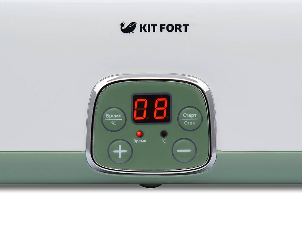 - Kitfort КТ-2007. Пластиковая йогуртница мощностью 20 Вт. Есть дисплей, на котором отображается информация о заданной программе, процессе приготовления. Таймер до 48 часов, регулировка температуры, сигнал об окончании работы, автоматическое отключение. Есть четыре баночки из стекла, объем каждой 180 мл.