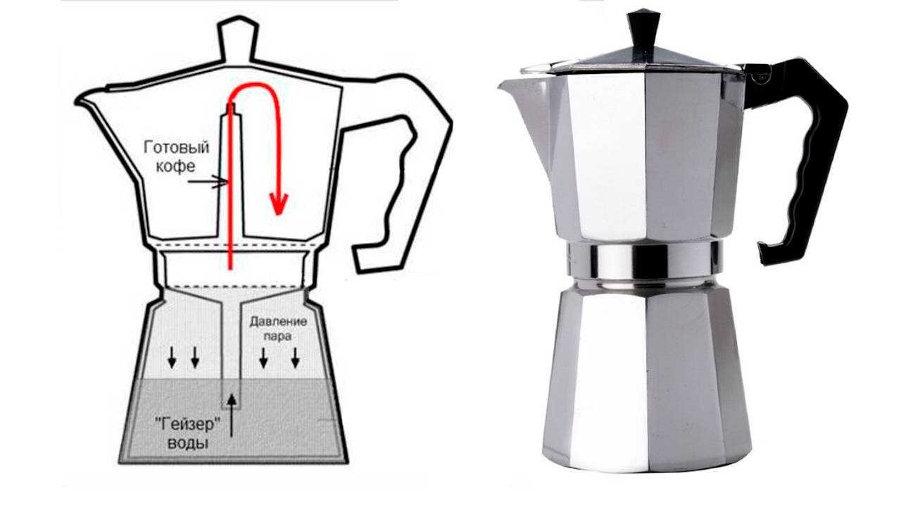 Принцип работы. Под избыточным давлением пара вода из нижней части через фильтр с кофе поступает в верхнюю чашу, где собирается готовый напиток.