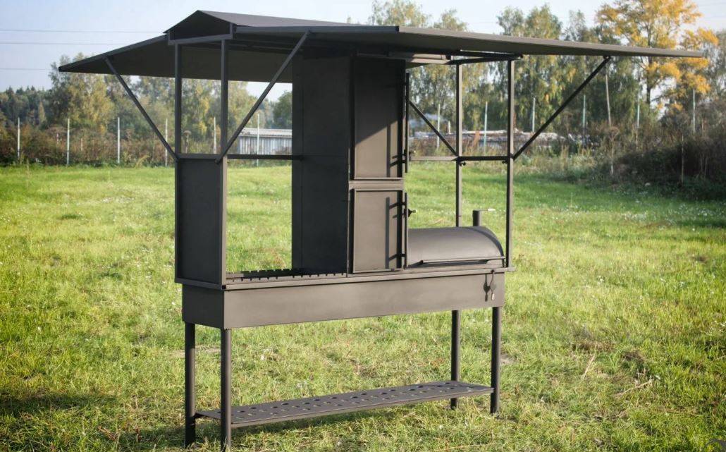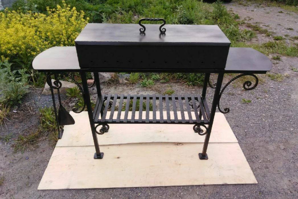 Усовершенствованные модели включают не только двойное дно или крышку, а и откидные полки различных размеров. На такой навесной столик можно поставить емкость с водой для погашения внезапно возгоревшихся углей или поместить соус, которым поливается мясо во время приготовления.