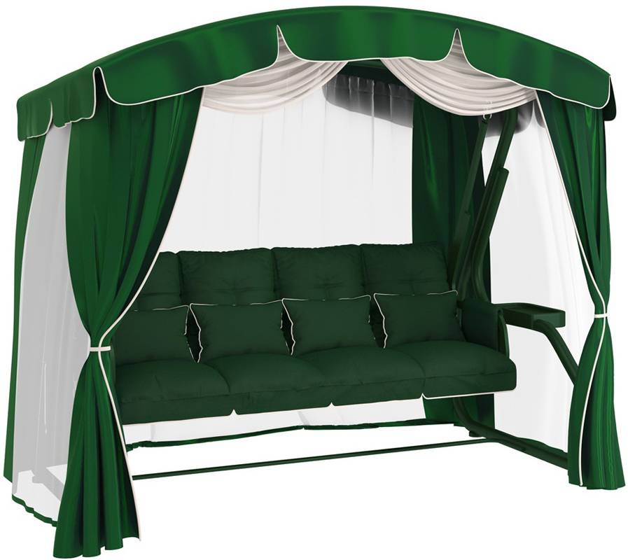Качественные садовые качели, выполненные в виде уютной, вместительной беседки с комфортным диваном для четырех человек. Каркас выполнен из стальной трубы, выдерживает максимальную нагрузку в 400 кг. В основании сиденья-дивана сварная сетка. Угол наклона спинки регулируется, а сиденье модифицируется в кровать. Конфигурация изделия дополнена широким навесом, а также встроенной подсветкой. Изделие комплектуется. В комплект также входит москитная сетка, и съемный тканевый чехол с боковыми шторами. Также изделие дополнено матрасом, подушками, удобными подлокотниками, полочками для стаканов. Что касается дизайна, он представлен в двух вариантах – насыщенном зеленом и шоколадно-коричневом. Средняя стоимость модели составляет – 20 990 руб.