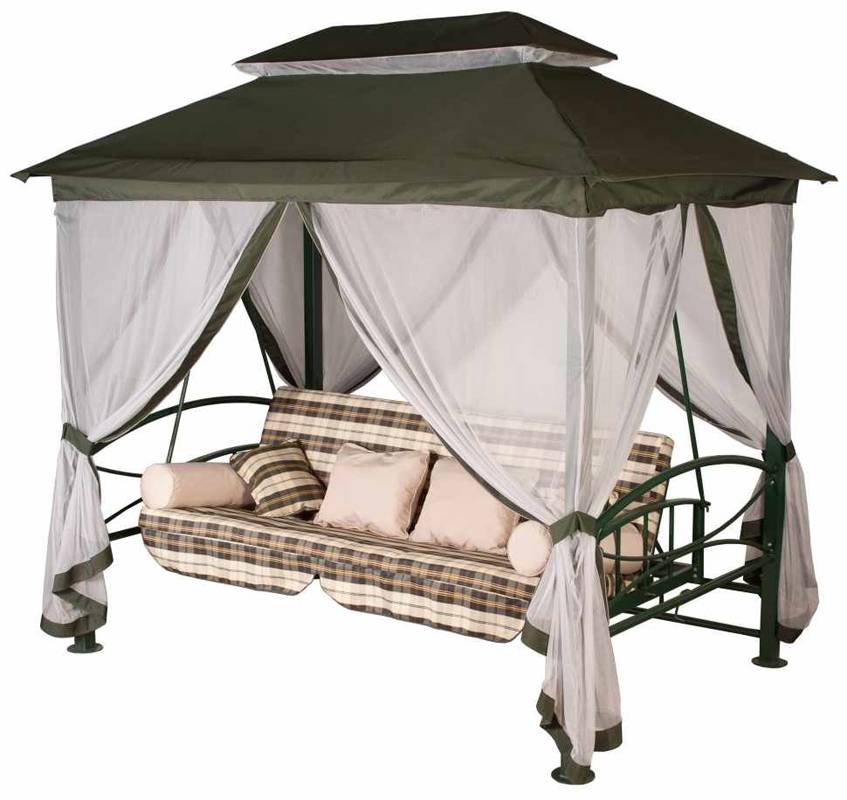 Эта модель представляет собой качели-беседку с широким тентом, под которым можно дополнительно разместить другую садовую мебель. Каркас выполнен из толстой стальной трубы, а максимально допустимая нагрузка, на которую рассчитана конструкция, составляет 400 кг. Сиденье можно отрегулировать или трансформировать в кровать. Навес, выполненный из плотного полиэфира, надежно препятствует проникновению солнечных лучей. В комплект к изделию входят матрас и декоративные подушки, обладающие съемными чехлами. Средняя стоимость – 39 500 руб.