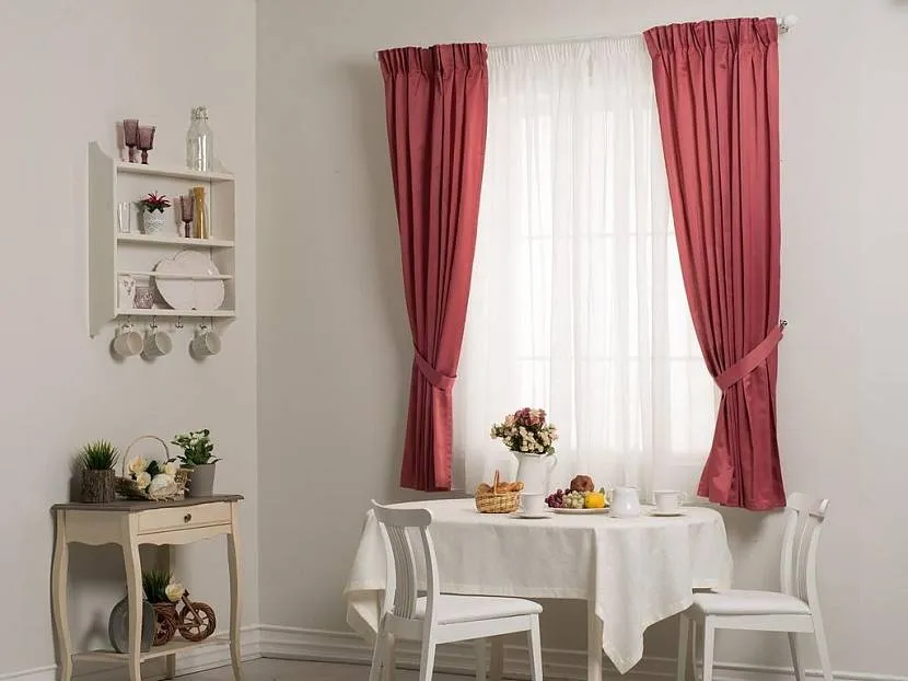Бордовые шторы в гостиной сочетаются с белыми и бежевыми стенами, но запрещены для сочетания с синим и фиолетовым цветами в разных оттенках. Подходят для просторных комнат с большими окнами.