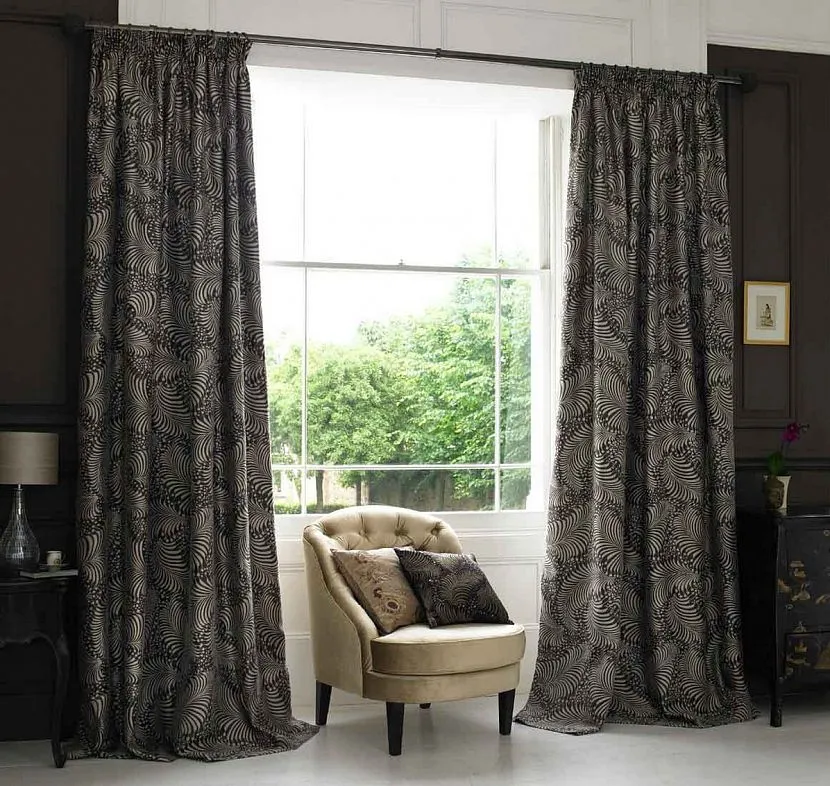 - плотные виниловые, бархатистые обои нуждаются в обрамлении жаккардовыми, льняными или хлопчатобумажными шторами;