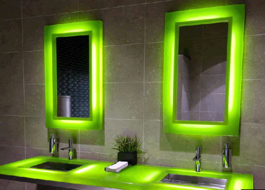 Неоновое свечение применяют в декоративных целях. Оно преображает интерьер, но искажает изображение в зеркале.