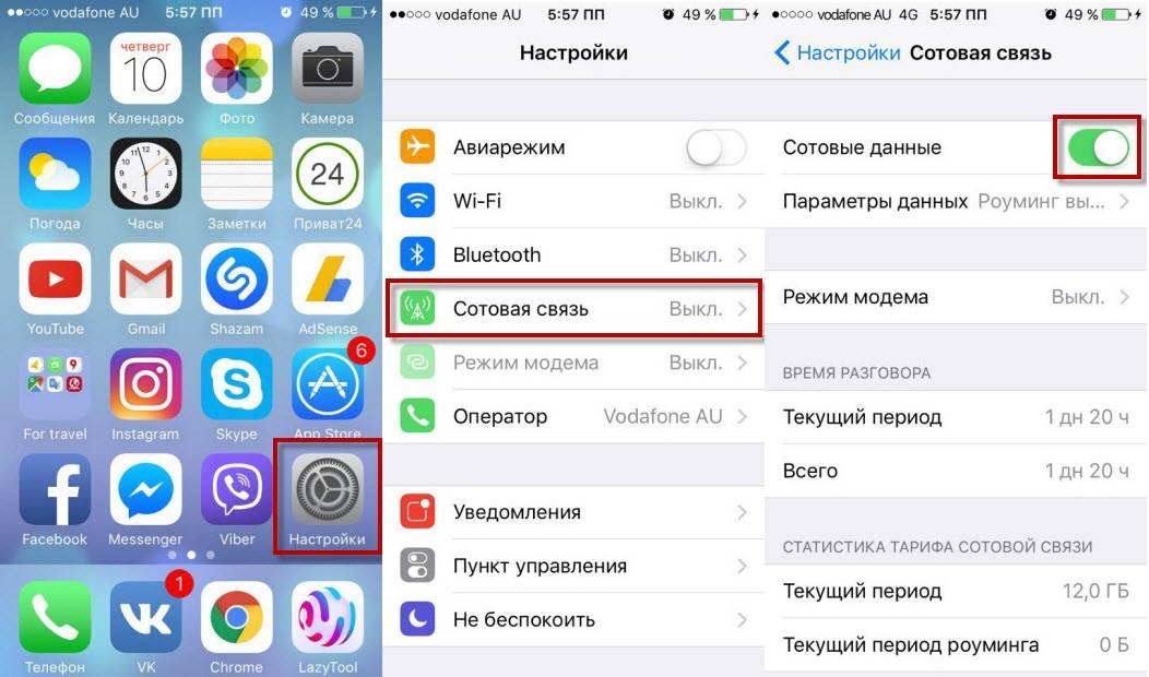 Для включения мобильного доступа в интернет следует установить положение ползунка «Сотовые данные» как указано на скриншоте.