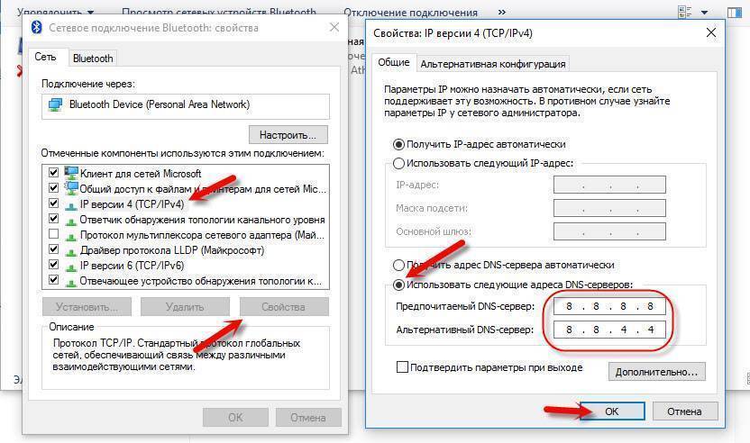 По идеи, после этих действий, интернет на компьютере уже должен работать. Но, у меня почему-то сайты не открывались. Решил я эту проблему заменой DNS-адресов. Зайдите в “Сетевые подключения”, нажмите правой кнопкой на адаптер “Сетевое подключение Bluetooth”, и выберите пункт “Свойства”. Затем, выделите пункт “IP версии 4 (TCP/IPv4)”, и нажмите на кнопку “Свойства”.