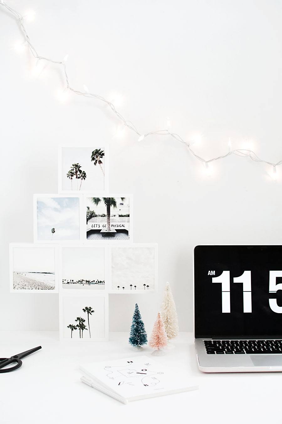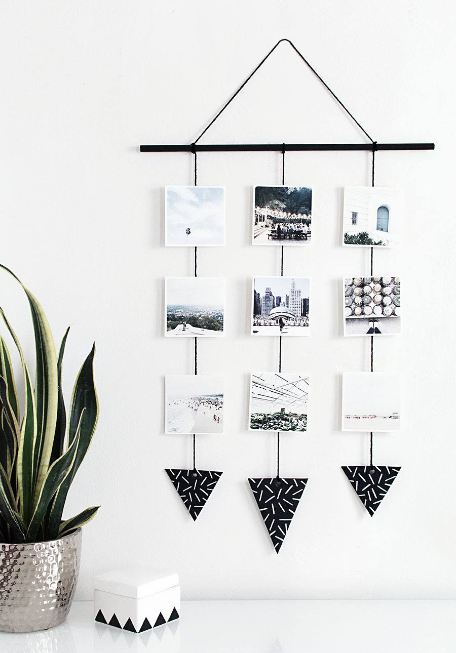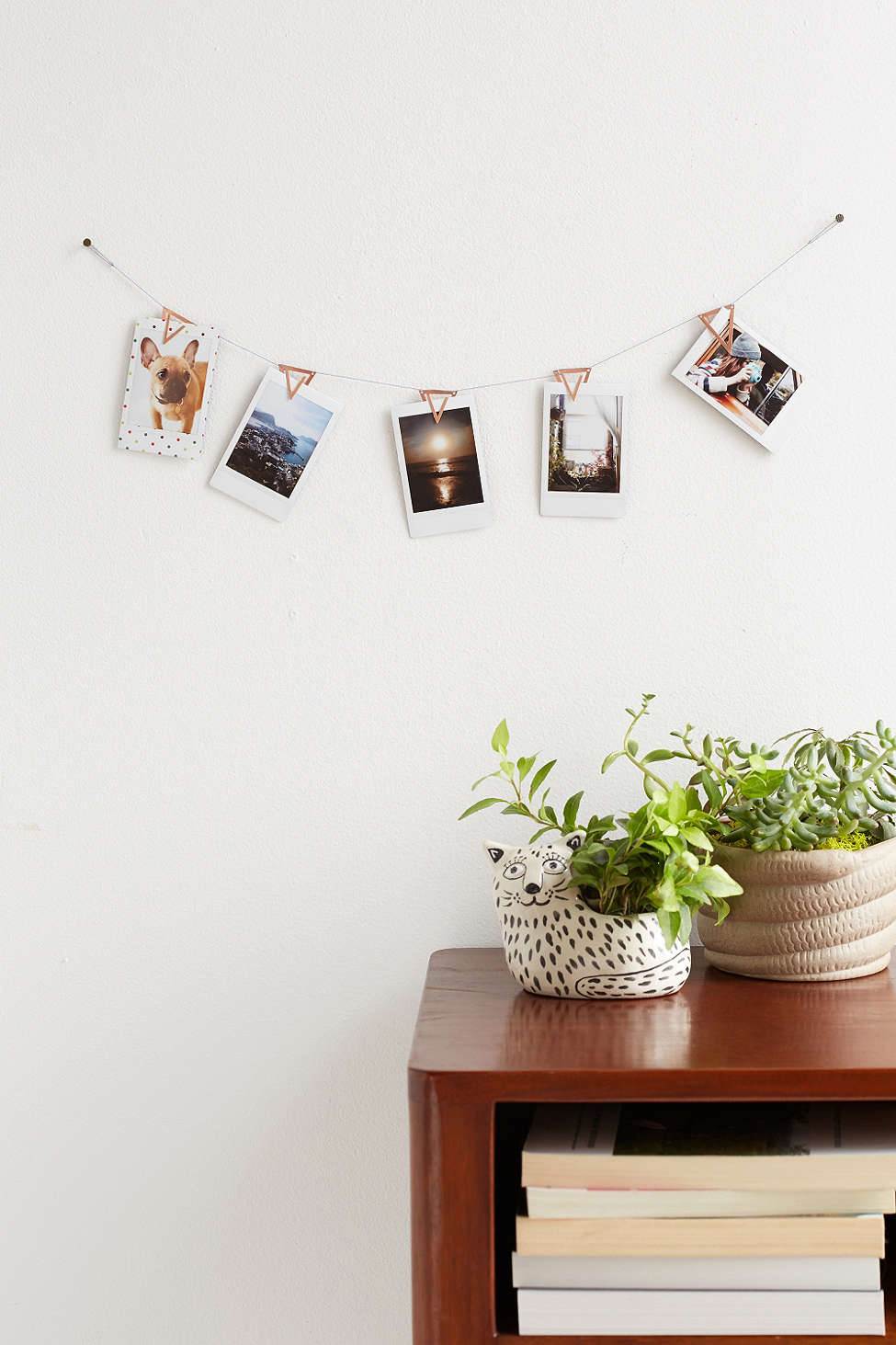 Прибили два гвоздика на разных концах стены, натянули между ними веревочку, и развешиваете фотографии, крепя прищепками.