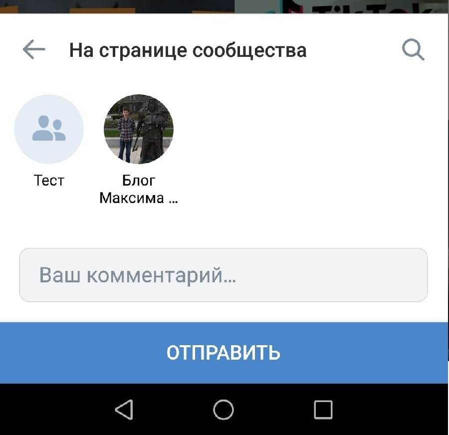 - если в сообщество, то нажимаете соответствующую кнопку, выбираете паблик и жмете «Отправить»;