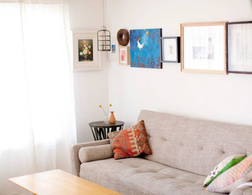 Кстати, большое количество фото на стене скроет заметные ее огрехи. Постарайтесь избегать больших отступов – в остальном все на ваше усмотрение.