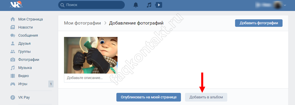 Если вы хотите загрузить картинку в какой-то из альбомов, то нажмите на соответствующую кнопку и выберите альбом. Также, можно просто выбрать вариант «Опубликовать на моей странице», в этом случае изображение не будет прикреплено к какому-либо альбому – так можно добавить фото в ВК в «мои фотографии».