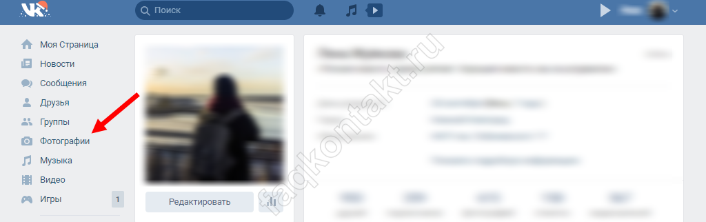 Зайдите на свою страницу и в левом части окна в меню переключитесь на раздел «Фотографии»;