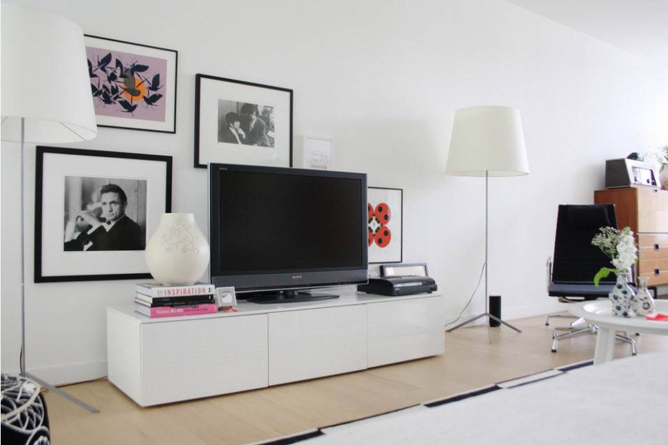 В этом помещении декоративный прием удачно обыграл пустую узкую стену. Чтобы композиция смотрелась гармонично, все снимки подобрали в черно-белой гамме.