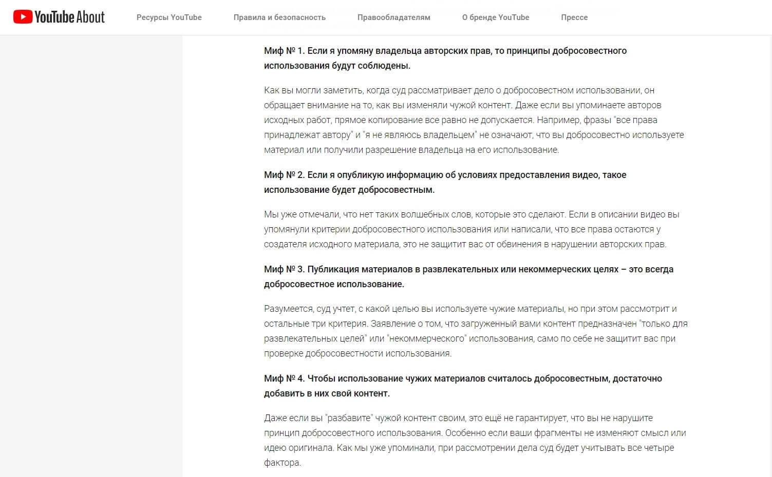 Не забудьте, что в случае с чужим контентом необходимо учитывать авторские права. Ютуб рекомендует связываться с правообладателями для обсуждения условий лицензии. Можно попытаться подогнать контент под правила «добросовестного использования» — но это довольно непросто. Здесь необходимо быть в курсе всех тонкостей, о которых знают, пожалуй, только юристы и судьи.
