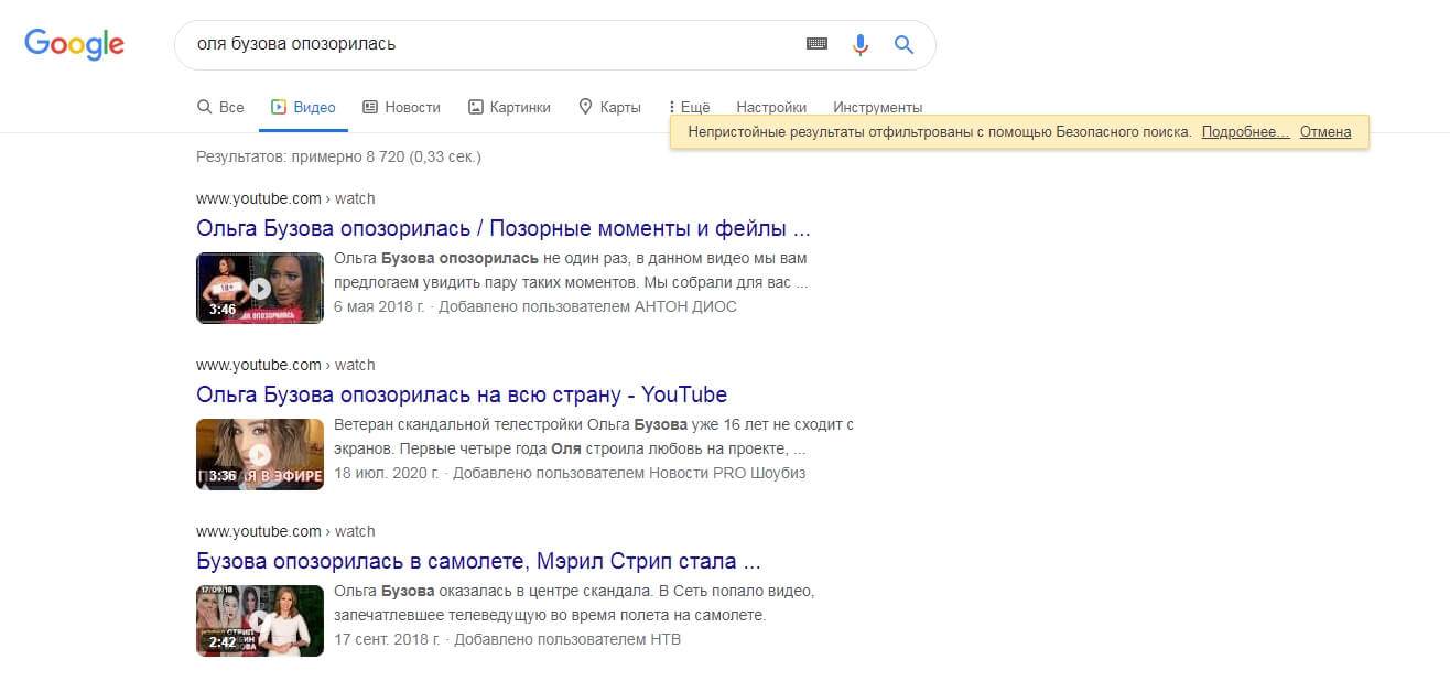 Если вам нужно конкретное видео, например, «Оля Бузова опозорилась», выручат Гугл и Яндекс. Они избавят от необходимости шерстить по другим ресурсам.