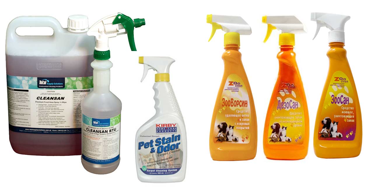 На рынке предлагается много современных спреев, предназначенных для борьбы с микробами и запахом. К примеру, «Зоосан», «Urine Off», «Дезосан», «Fresh» – спрей – нейтрализатор и другие. Основной компонент таких растворов: ферменты энзимы, которые разлагают все органические остатки без вреда для здоровья и ткани.