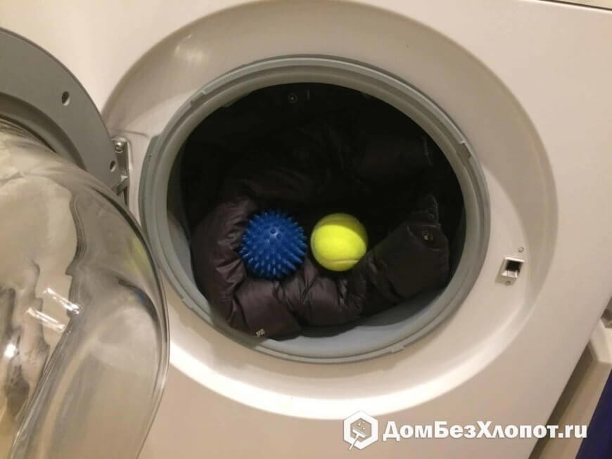 - Прежде чем стирать, закинуть в машину мячи для пуховиков. Можно использовать теннисные.