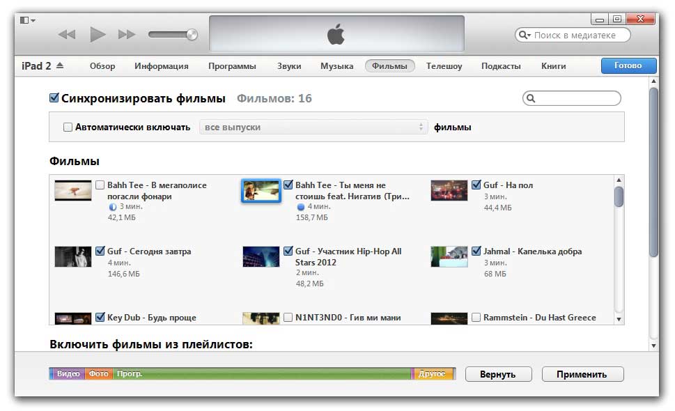 Останется лишь подключить iPhone или iPad к компьютеру, выбрать его в iTunes, отметить галочкой нужный контент в разделе «Фильмы» и нажать «Применить», а затем «Синхронизировать».